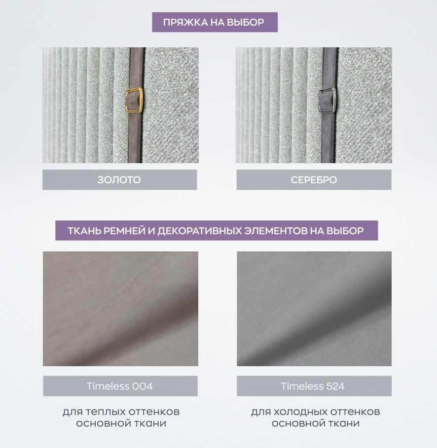 ОСОБЕННОСТИ ИЗГОЛОВЬЯ: Вертикальные вставки в виде ремня могут быть выполнены из ткани Timeless 004 или Timeless 524.