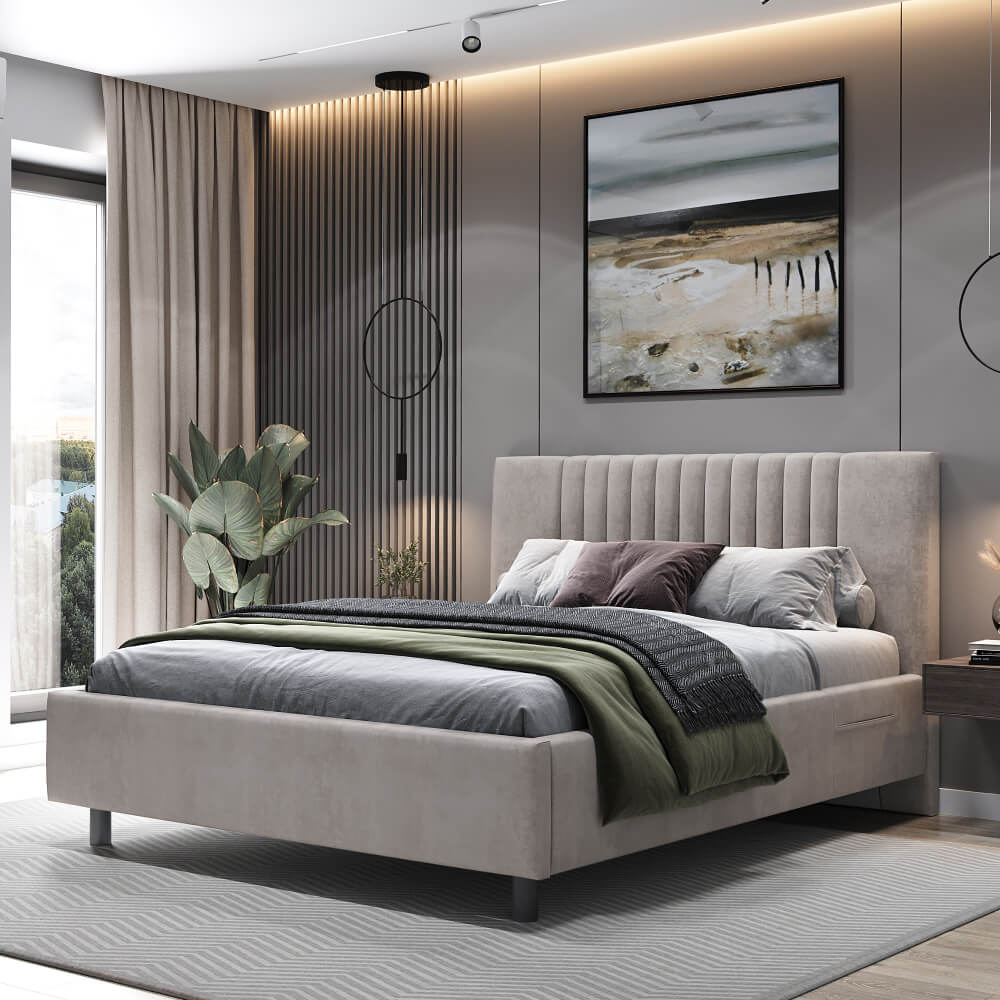 - Дизайн с вертикальными линиями изголовья, разбавят монотонность интерьера.