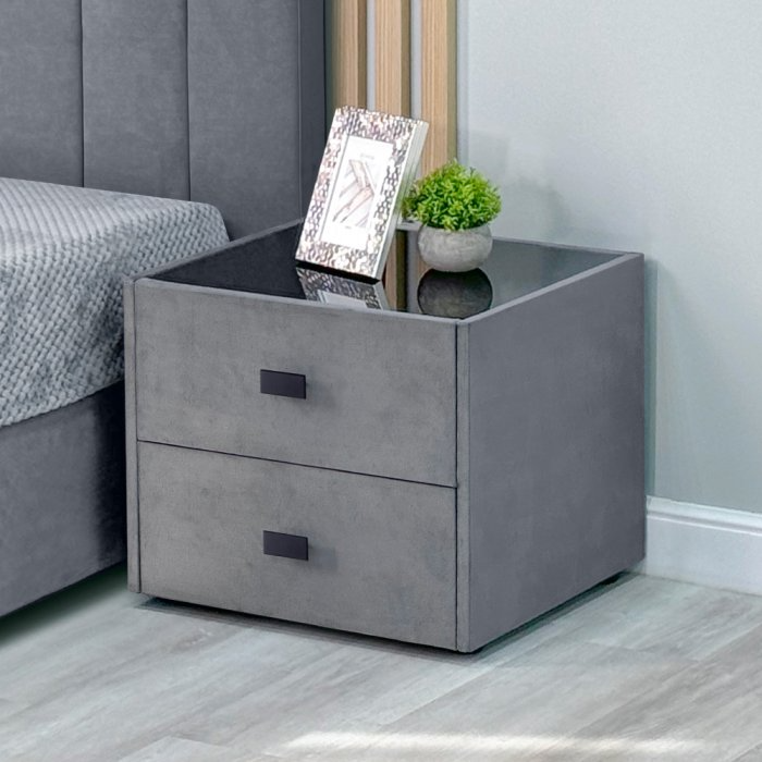 Прикроватная тумба органично сочетается с современным интерьером спальни. Оснащена двумя вместительными ящиками с шариковыми направляющими. Крышка тумбы комплектуется стеклом, которое защищает мягкое покрытие от загрязнений и механических повреждений.
